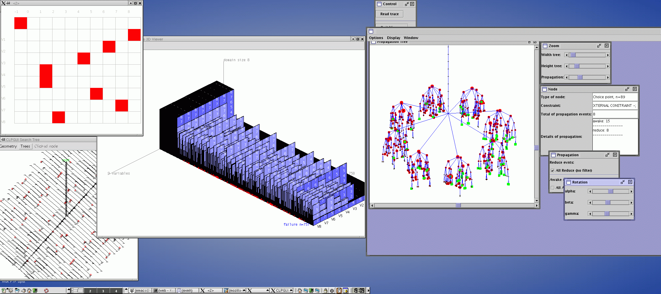 backtrack before the first solution). The visualisation variable/value with discovery is well adaptad (chessboard vue).